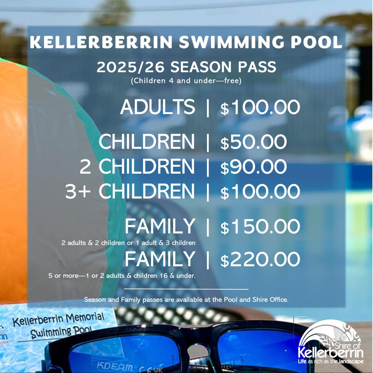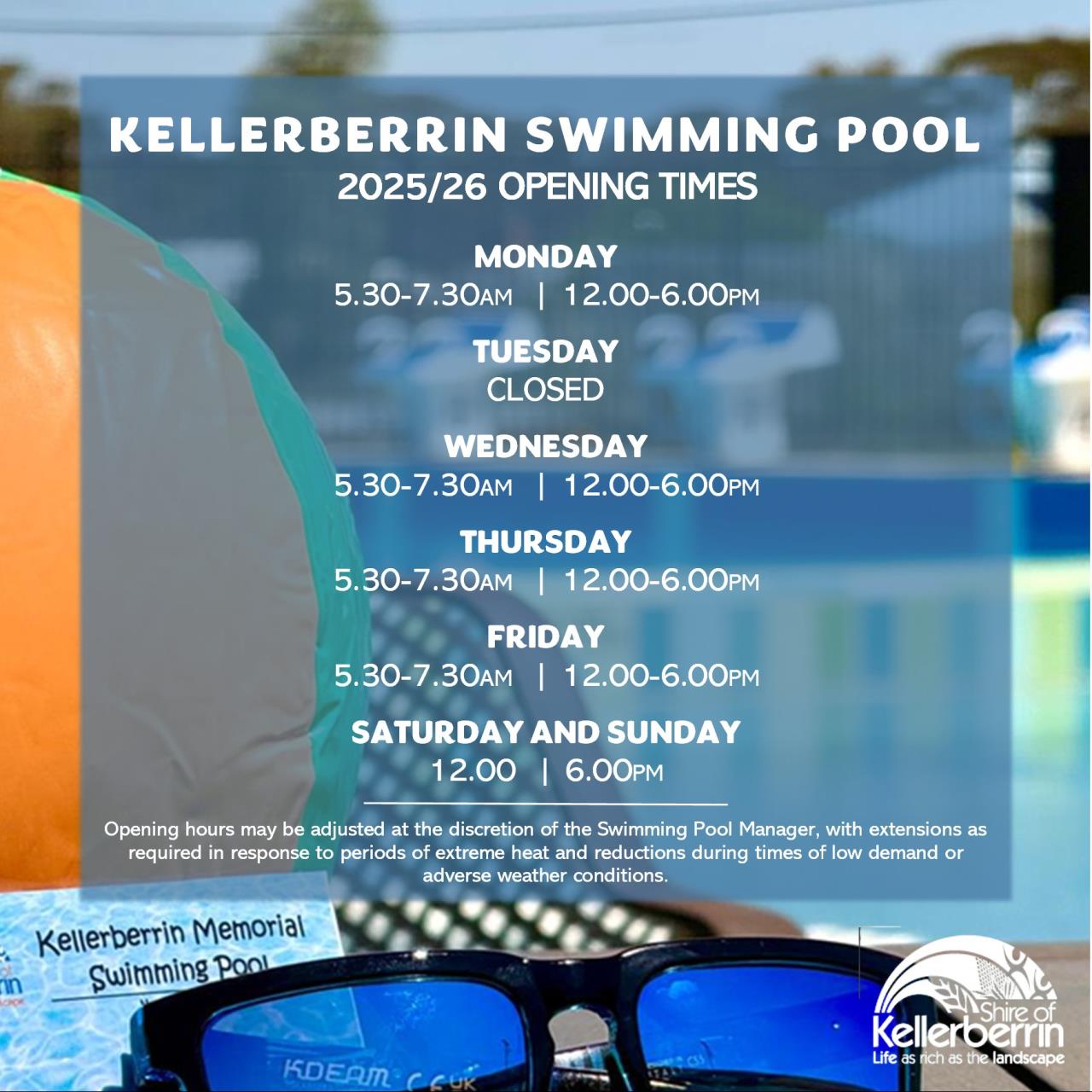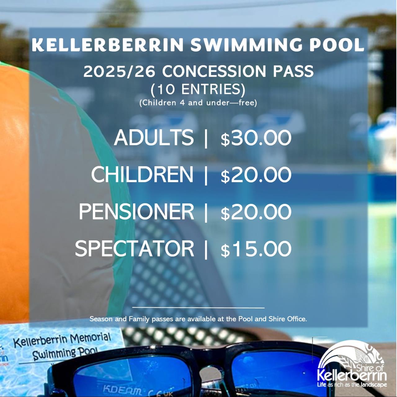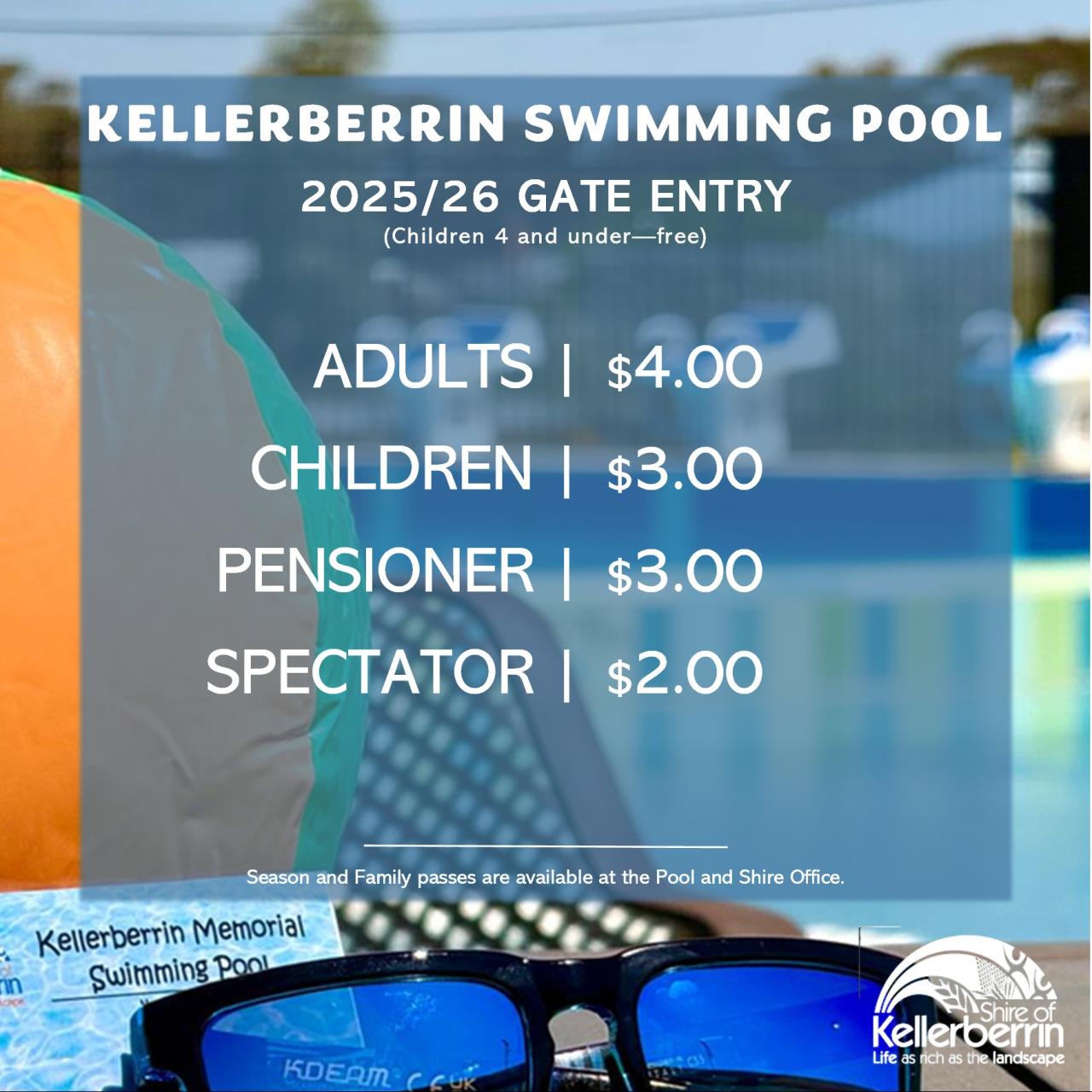 The Kellerberrin Memorial Swimming Pool is owned and managed by the Shire of Kellerberrin and is located on the corner of Hinckley and Gregory Streets.